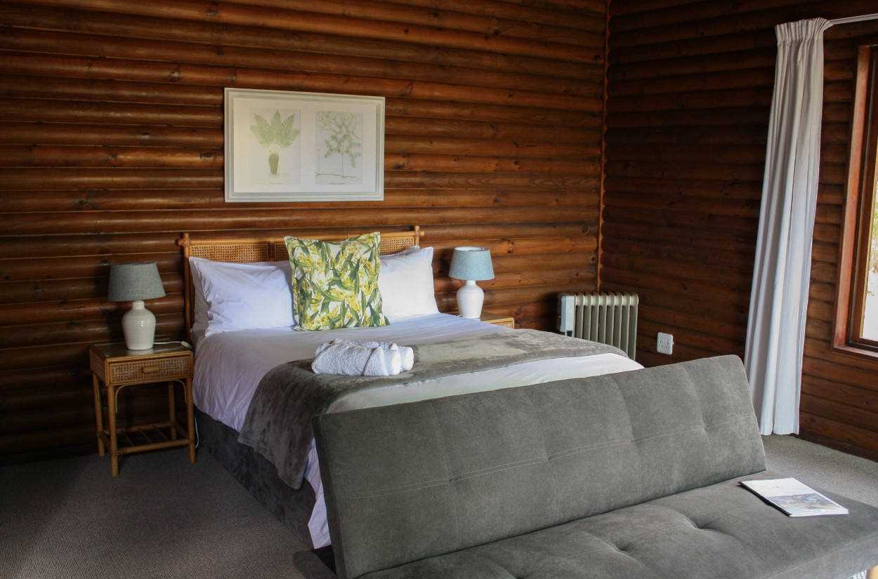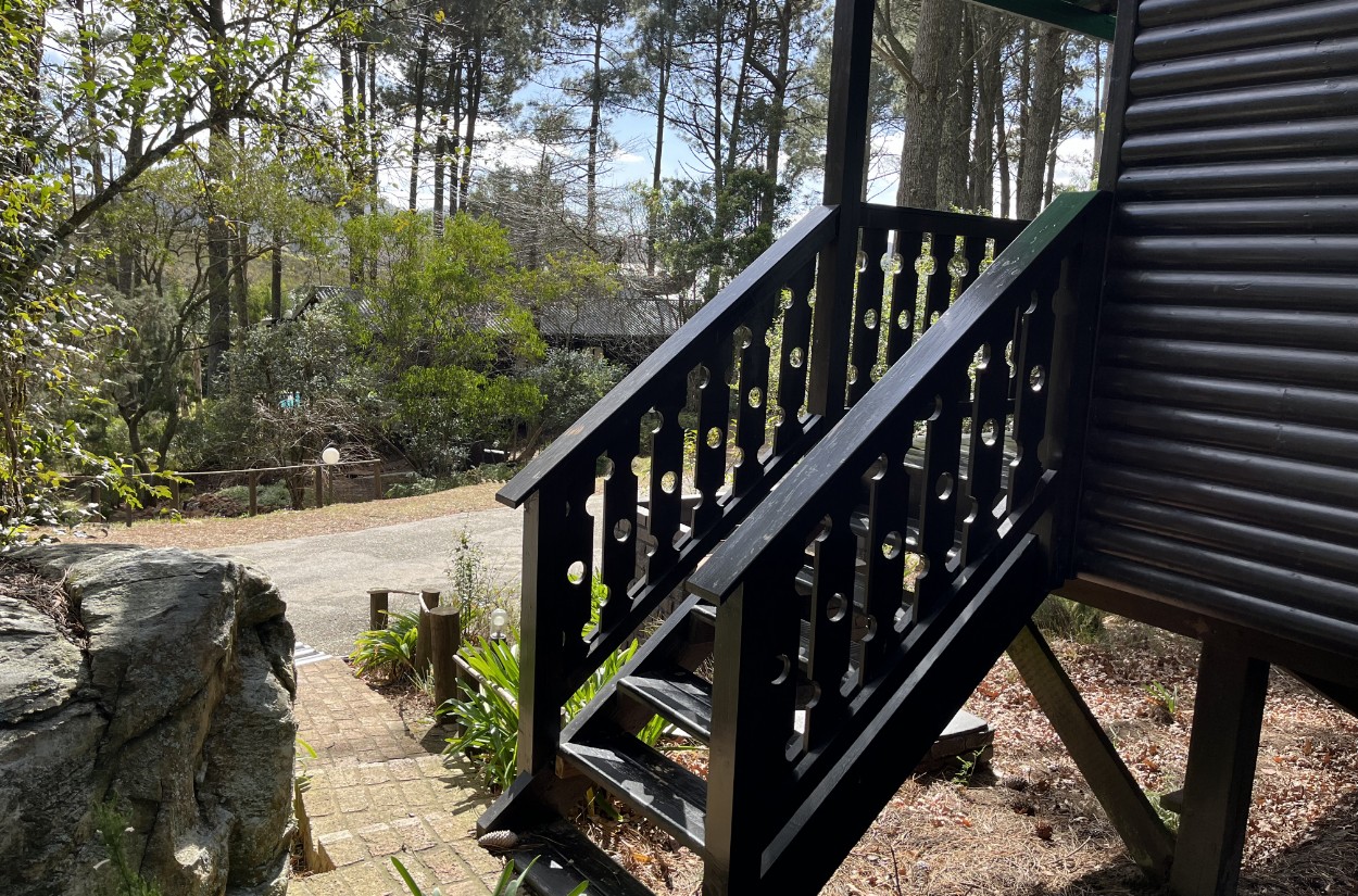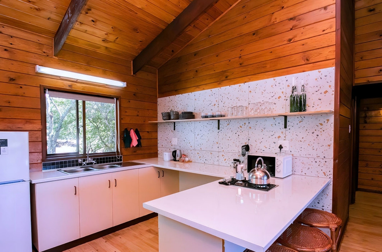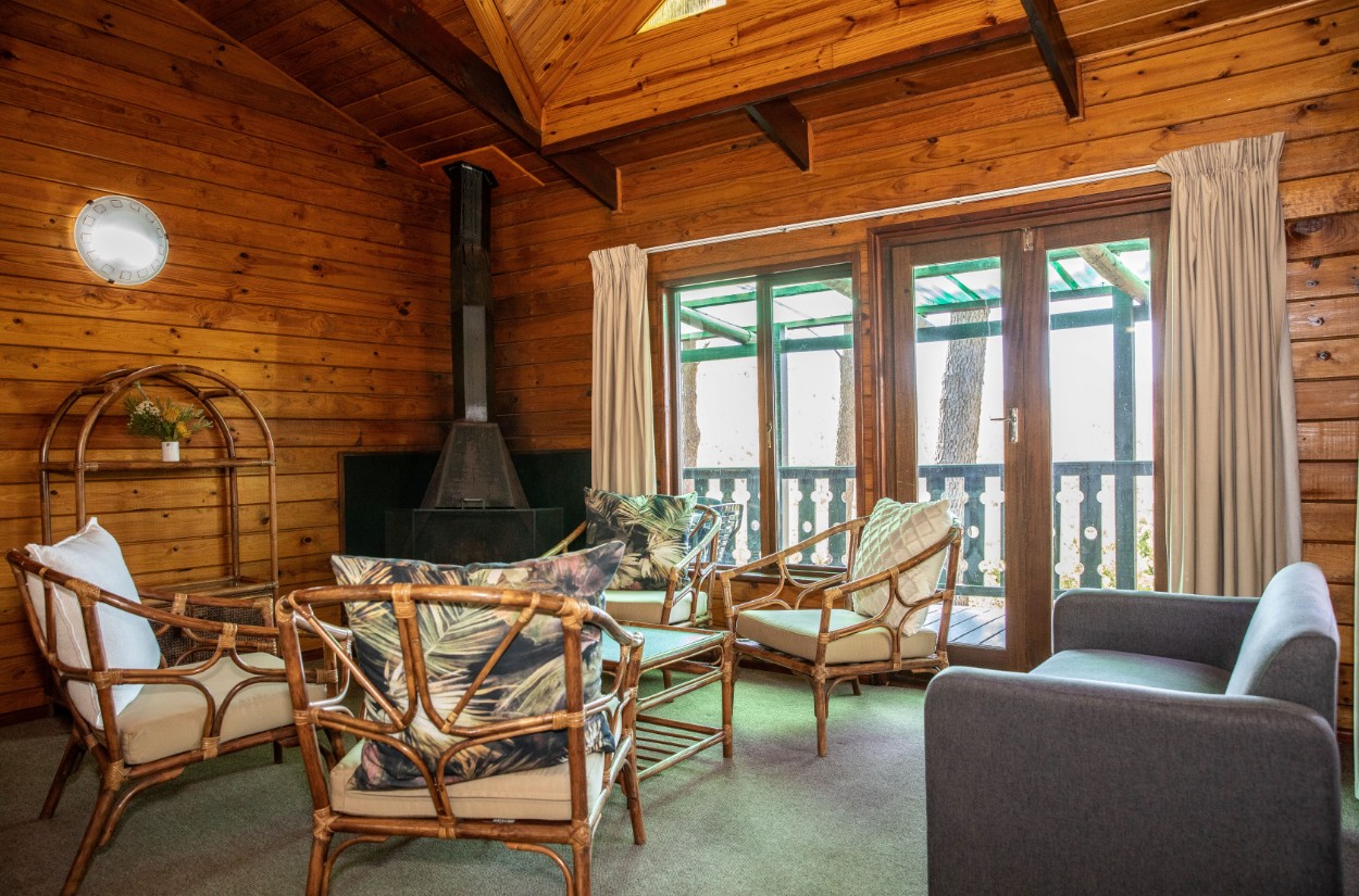 The over-night cabins are cute and cosy. Raised slightly above the ground and overlooking the lodge couples can start unwinding and fully embrace the overwhelming stature of the pine forest surrounding the cabins. Each unit has a large open plan bedroom and lounge with an en-suite bathroom. The timber finishes throughout the unit with its open rafters create a pleasant and warm mountain cabin experience.