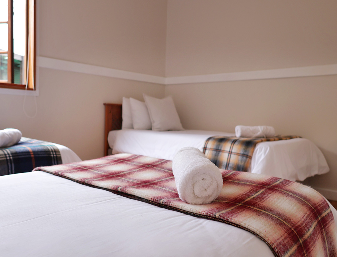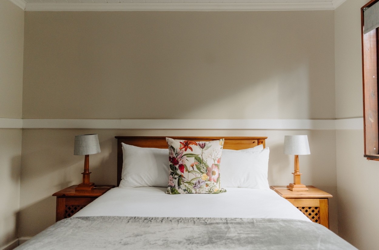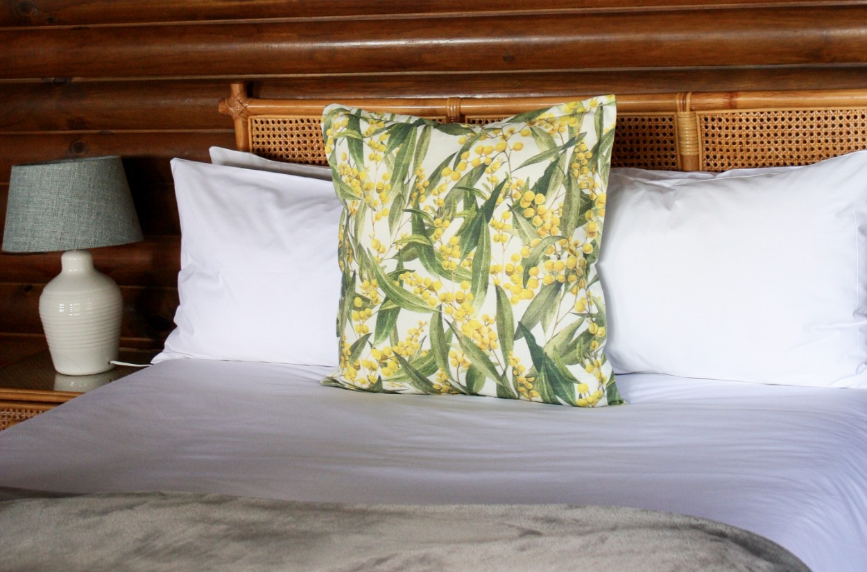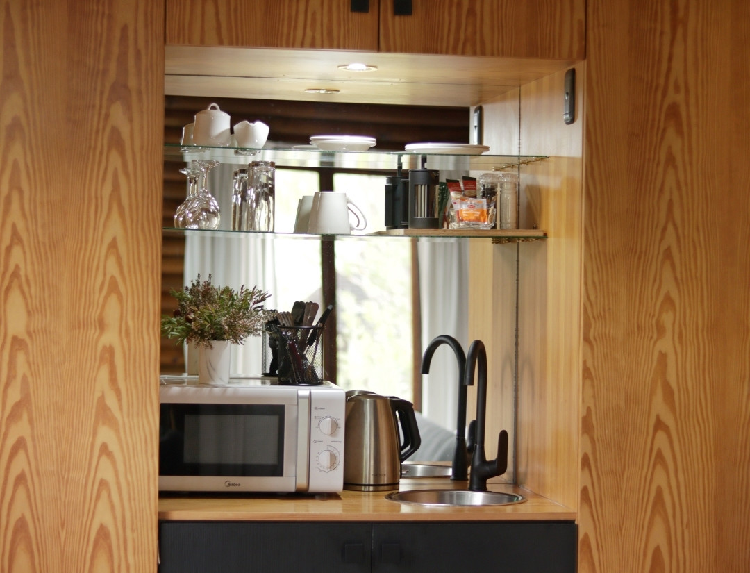 The over-night cabins are cute and cosy. Raised slightly above the ground and overlooking the lodge couples can start unwinding and fully embrace the overwhelming stature of the pine forest surrounding the cabins. Each unit has a large open plan bedroom and lounge with an en-suite bathroom. The timber finishes throughout the unit with its open rafters create a pleasant and warm mountain cabin experience.