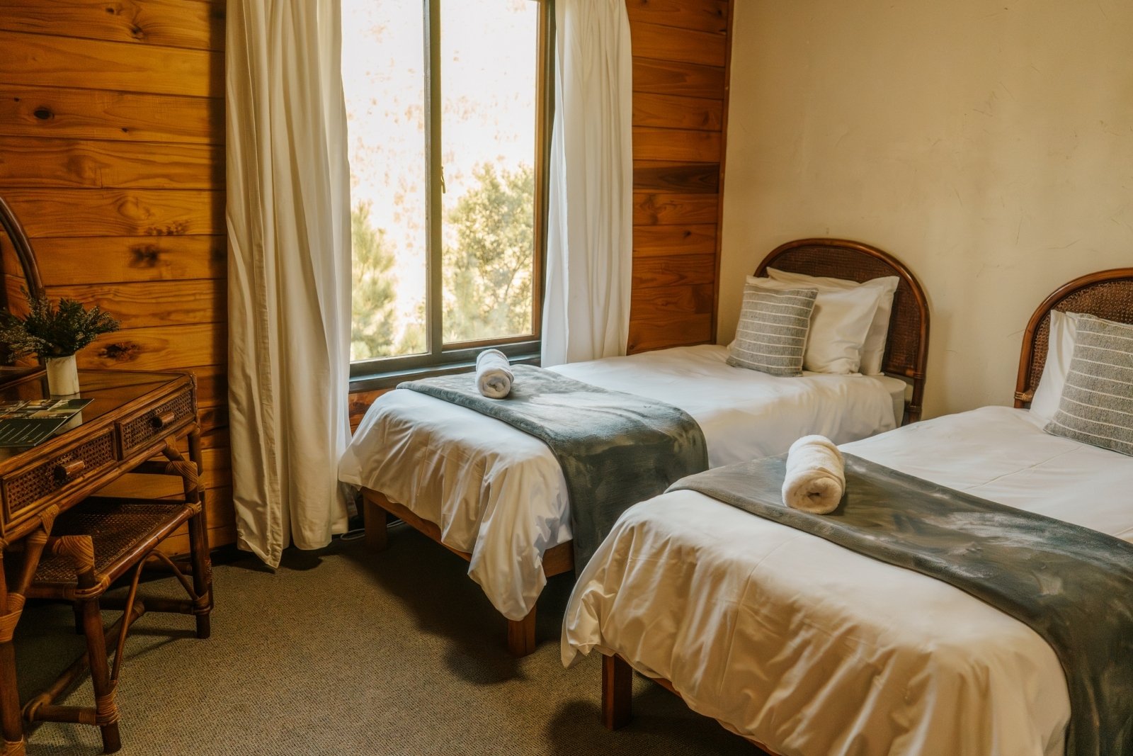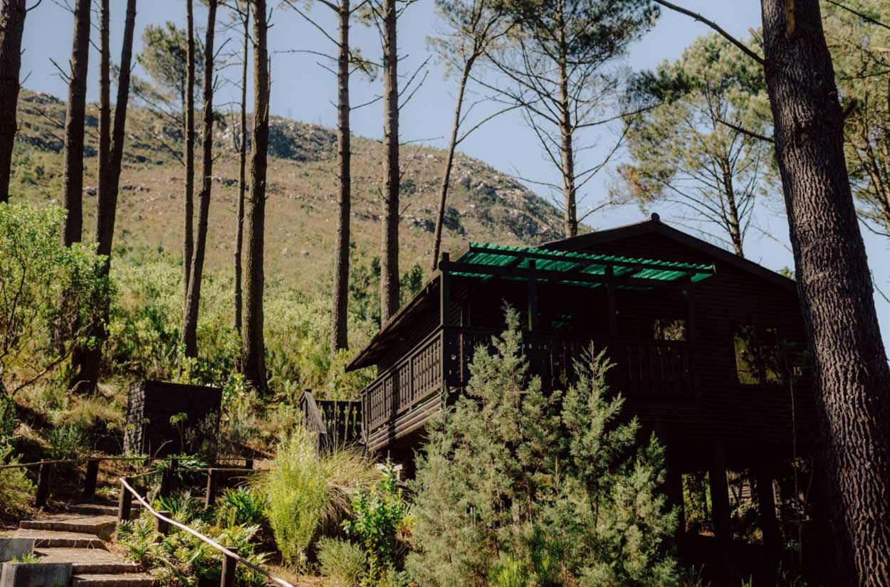 Our timber log cabins are built on an evenly-sloped side of the mountain blending in with the surrounding fynbos hills and King Proteas growing an arms-length between the cabins. Two natural mountain springs supply the entire terrain including Te-eeT Restaurant, Te-piK Café, all 16 log cabins, and the swimming pool unlocking an appreciation for the clean beauty of nature and the valuable commodity that clean fresh water ought to be.